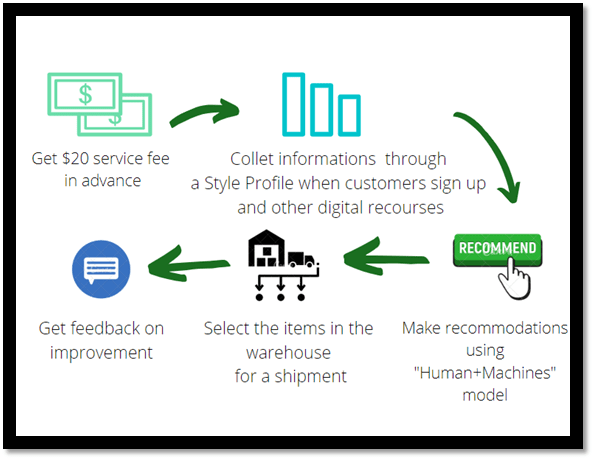 Once received $20 from customer, Stitch Fix send them 5 items that they think customers will like, then the customers can either keep the items they want or send them back. If they failed to keep any item, they are invited to give insightful feedback directly to stylists, to receive better service provided to her next time but others as well.